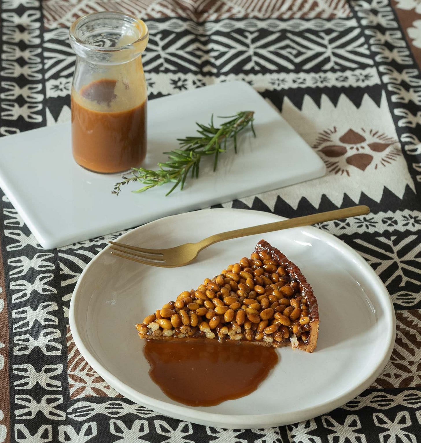 Its piney, citrus-leaning notes add a fresh, slightly savoury lift that makes sweet things sing. Think shortbread with a whisper of rosemary sugar, poached pears infused with a sprig, panna cotta with a rosemary-honey drizzle or Darren’s rather seductive Pinenut Honey Caramel & Rosemary Tart pictured below. It’s one of those herbs that rewards a little boldness—so next time you’re baking, don’t be shy about slipping it into the sweet side of your repertoire.