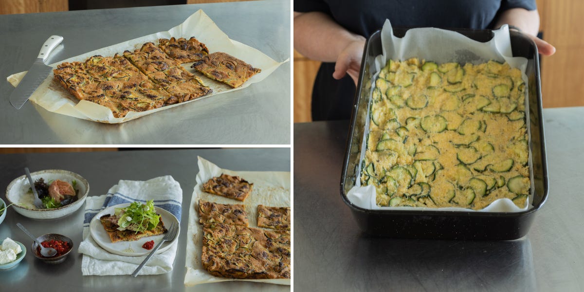 Think of it as a rustic, full-flavoured, zucchini slice that's perfect for a light lunch or brunch. Serve it warm or at room temperature with a zesty lemon vinaigrette and a few generous crumbles of feta, or dress it up with poached eggs, shaved prosciutto, and a spoonful of fermented chilli for some fiery extravagance.
